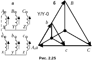 В трехфазных трансформаторах можно получить 12 различных групп соединений обмоток. Рассмотрим несколько примеров. Пусть обмотки трансформатора соединены по схеме Y/Y (рис. 2.25). Обмотки, расположенные на одном стержне, будем располагать одну под другой. Зажимы А и а соединим для совмещения потенциальных диаграмм. Зададим положение векторов напряжений первичной обмотки треугольником АВС. Положение векторов напряжений вторичной обмотки будет зависеть от маркировки зажимов. Для маркировки на рис. 2.25, а ЭДС соответствующих фаз первичной и вторичной обмоток совпадают, поэтому будут совпадать линейные и фазные напряжения первичной и вторичной обмоток (рис. 2.25, б). Схема имеет группу Y/Y 0.