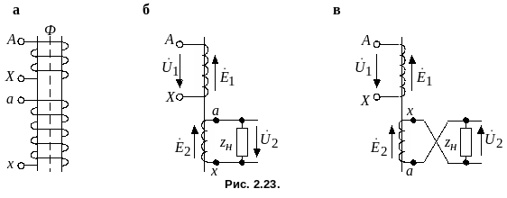 Рассмотрим вначале влияние маркировки на фазу вторичного напряжения по отношению к первичному на примере однофазного трансформатора (рис. 2.23, а).
