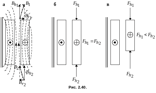 При симметричном поле эти силы уравновешивают друг друга. Если обмотка расположена несимметрично по высоте стержня, то равновесие сил нарушается (рис. 2.40, в). Это может привести к деформации отдельных частей обмотки или даже к ее разрушению. Расположение переключаемых витков в средней части обмотки устраняет эту опасность.