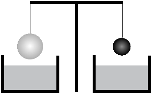 Два одинаковых стальных шара уравновешены на рычажных весах (см. рисунок). Нарушится ли равновесие весов, если один шар опустить в машинное масло, а другой – в бензин?