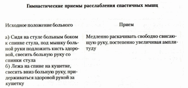 В позднем восстановительном периоде часто имеет место выраженное повышение мышечного тонуса. Для его снижения нужно выполнять специальные упражнения. Особенность этих упражнений: при лечении положением паретичные руку и ногу фиксируют на более длительное время. Съемные гипсовые лонгеты накладывают на 2-3 часа 2-4 раза в день, а при значительной спастичности оставляют на ночь.