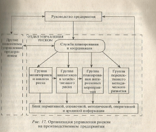 Руководству предприятия принадлежит ключевая роль в решении проблем управления риском. Отчеты отдела по управлению риском должны представляться высшему руководству компании. Точно так же именно руководство рассматривает и утверждает программы мероприятий по управлению уровнем хозяйственного риска, утверждает предложенные хозяйственные решения вместе с антирисковыми программами, если считает их обоснованными, либо отвергает их, принимает решении о начале реализации антирисковых программ в критических ситуациях. Заметим в связи с этим, что непосредственная реализация мероприятий по управлению риском зачастую может противоречить деятельности основных производственных и управленческих подразделений предприятия, так как требует затрат, не приносящих сиюминутных доходов, или омертвления части капитала при создании страховых резервов. Поэтому крайне важно, чтобы окончательные антирисковые решения принимались на высшем уровне управления, где стоящие перед предприятием глобальные цели, связанные с обретением стабильности и устойчивости работы, улучшением финансового положения и ростом масштабов хозяйственной деятельности, не заслоняются промежуточными, «местническими» целями отдельных подразделений и их управляющих.