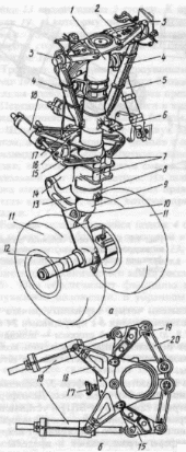 Цилиндр-подъемник 7 для уборки и выпуска стойки шасси, замки (механические или (и) гидравлические) для фиксации стоек шасси в убранном и выпущенном положениях. В зависимости от особенностей конструкции шасси опора может включать в себя еще и следующие элементы, гасители колебаний (демпферы) для гашения самовозбуждающихся колебаний как всей опоры в целом (в основном передней опоры) — см. поз. 18 на рис. 1.11, поз. 6 на рис. 1.12, так и ее отдельных элементов (например, тележки с колесами) — см. поз. 5 на рис. 1.8, подкосы и раскосы в виде стержней, представляющих собой дополнительные опоры стойки.