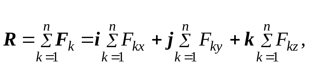 где i, j, k – единичные векторы (орты). Тогда равнодействующая системы сходящихся сил равна векторной (геометрической) сумме слагаемых