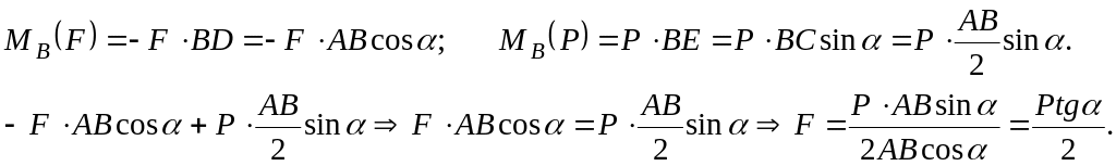 Для каждой из сил проводим линии действия AD – для силы F и ОЕ для силы Р. Далее из точки В опускаем перпендикуляры BD и ВЕ на каждую линию действия. Находим моменты от действия каждой силы и подставляем их в выражение (2.12)