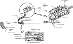 Камера сгорания оборудована 20 двойными форсунками (рис. 38). Каждая форсунка оборудована топливным сепаратором для разделения топлива на первичный и вторичный потоки. Топливный сепаратор представляет собой клапан, открывающийся при определенном давлении (70 ±10 кГ/см2). Это происходит при сильном напоре на отверстие первичного потока.