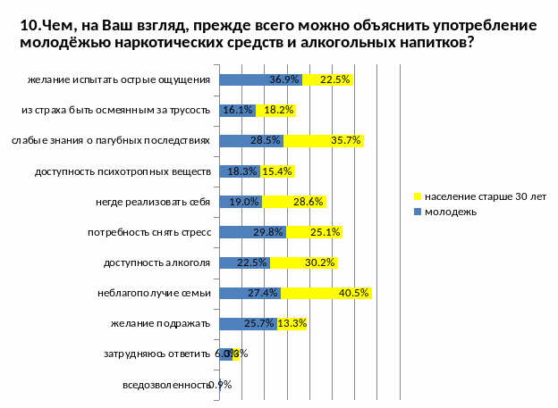 Результаты населения немного расходятся с мнением молодёжи: бесконтрольность со стороны родителей (67,5%), неблагополучное социальное окружение (36,1%), незанятость молодёжи (60%), отсутствие жизненных целей (61,3%), безнаказанность (17%) и социальное неравенство (18,9%)