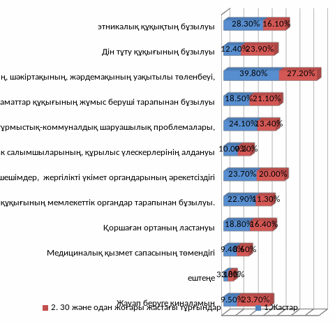Қалған тұрғындар келесі себептерді көрсетті: зейнетақының, шәкіртақының, жәрдемақының уақытылы төленбеуі – 27,2%, жұмыс беруші тарапынан құқыққа шек қойылуы - 21,1%, дін тұту еркіндігіне шек қойылу және әділетсіздік, жергілікті үкімет органдарының әрекетсіздігі - 23,9% респонденттер.