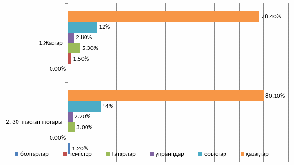Әлеуметтік зерттеуге қатысқан жастар: 14-тен 29 жасқа дейін: олардың ішінде қазақтар – 78,40%, орыстар – 12,0% , украиндар - 2,8% , татарлар - 5,3%, неміс - 1,5%, болгарлар - 30 жастан жоғары тұрғындар: қазақтар – 80,1% , орыстар – 13,5% украиндар – 2,2% татарлар – 3,0% және болгарлар 1,2%.