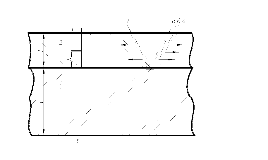 Процесс отверждения покрытий можно представить следующим образом [39] (рисунок 3.12). В слой материала 2, нанесенный на подложку 1, входит поток лучистой энергии а-б-в-г. Часть этого потока а поглощается в слое материала и превращается в тепло, вследствие чего поверхности подложки достигает только поток б-в-г, часть которого б поглощается в поверхностном слое подложки, нагревая последнюю, а лучистая энергия в-г отражается от поверхности подложки. Отраженное излучение частично поглощается слоем лакокрасочного материала в, а некоторая доля его г выходит из слоя ЛКМ в окружающее пространство и практически не используется.