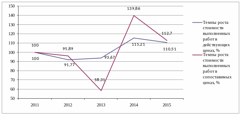 Из рисунка 2 видно, что темпы роста объема работ и услуг в сопоставимых ценах заметно снижается от 2012 к 2013 годам, затем наблюдается рост темпа роста от 2013 к 2014 годам. В действующих ценах наблюдается более стабильное изменение темпа роста объема выполненных работ.