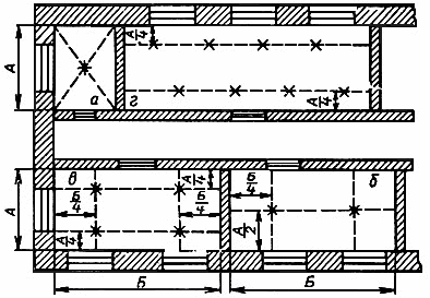 - расположение светильников зависит от их количества в помещении. Если в помещении предусматривается установка одного светильника, его размещают в центре потолка, в точке пересечения диагоналей, (рис.40, а) Если необходимо установить два светильника, их размещают на большей средней линии помещения, (рис.40, б). При установки четырех светильников их размещают, как показано на рис.40, в. В служебных помещениях большой площади светильники, как правило, размещают в шахматном порядке (рис.40, г). При наличии в проекте указаний по размещению светильников необходимо строго ими руководствоваться;