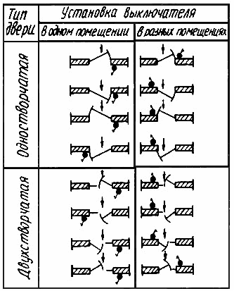 - выключатели для светильников общего освещения устанавливаются на высоте от 0,8 до 1,7 м от пола, в помещениях для пребывания детей - на высоте 1,8 м и размещаются таким образом, чтобы они не закрывались открывающимися дверями. Рекомендуемые места установки выключателей показаны на рис.41.;