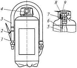 1 - пистолет; 2 - рычаг; 3 - рукав; 4 - пломба; 5 - сифонная труба; 6 - баллончик; 7 - игла; 8 - корпус; 9 - чека