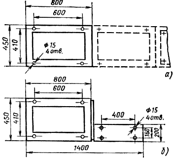 На рис. 1, б показано крепление блочной панели ВРУ1 - 41 - ОЩ, состоящей из распределительной панели ВРУ1 и шкафа КК878 (КК879) с аппаратурой автоматического управления освещением. Шкафы КК878 (КК879) имеют габариты 1200Х600Х200, с подставкой 500Х600Х200 мм. Они могут также устанавливаться отдельно от распределительных панелей ВРУ1.