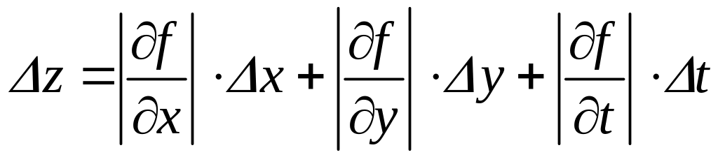 тобто, похибку непрямого вимірювання шукають згідно з тими ж правилами, що й повний диференціал цієї величини. Формальна відмінність полягає в тому, що всі арифметичні знаки ± при чутливостях змінюються на знаки +, а знаки диференціалів d – на значки похибок Δ.