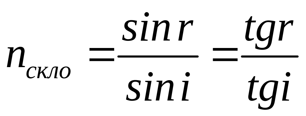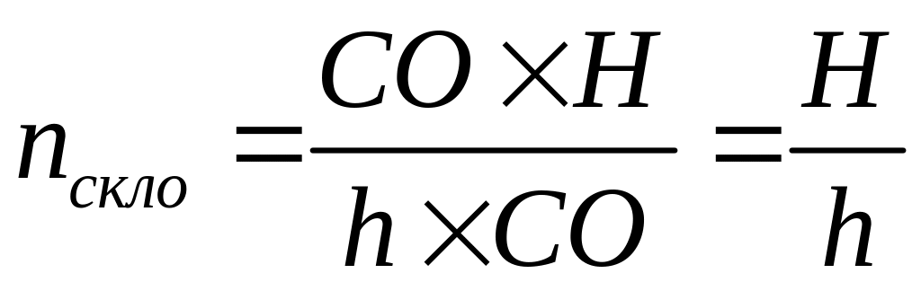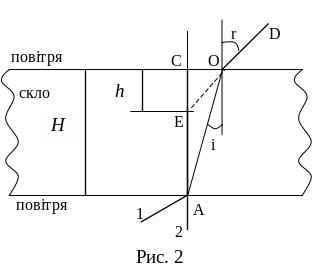 Одним з методів експериментального визначення показника заломлення скла є метод за допомогою мікроскопа. Схема проходження променів через скляну пластинку дана на рис. 2. В точку А падає два промені 1 і 2. Промінь 2 падає нормально і, не заломлюючись, виходить в точці С. Промінь 1 заломлюється і виходить в напрямку до точки D. Якщо дивитись з точки D в напрямку DО, то спостерігач буде бачити точку перетину променів ОD і АС не в точці А, а в точці Е, тобто товщина пластинки буде здаватись меншою Н і рівною СЕ = h. Для променів, близьких до нормально падаючих, кути падіння і заломлення малі. В цьому випадку синуси можна замінити тангенсами і за законом заломлення (7), розглядаючи обернений хід променів від D до А, можна записати: