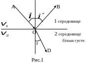 При проходженні світла через плоску границю двох прозорих середовищ неоднакової оптичної густини падаючий промінь АО розділяється на відбитий промінь ОВ і заломлений промінь OD (рис.1). При цьому: