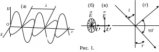 При відбиванні природного світла від діелектриків, заломлені ті, що проходять через деякі кристали, можна одержати промені, в яких коливання вектора здійснюється в одній площині. Таке світло називається плоскополяризованим (Рис.1(в)). За законом, встановленим Брюстером, відбитий промінь буде повністю поляризованим, якщо кут падіння і (Рис. 1(г)) зв’язаний з показником заломлення n таким співвідношенням: