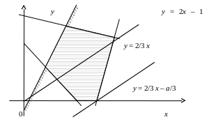 Рассмотрим теперь целевую функцию f. Для определенности возьмем f = 2x – 3y, и пусть f → max. Рассмотрим всевозможные прямые вида 2x – 3y = a, где а меняет свои значения. Например, при а = 0 имеем прямую 2x – 3y = 0, или y = 2/3 x. Для произвольного а прямая имеет уравнение y = 2/3 x – a/3. Все эти прямые параллельны друг другу. Можно сказать, что это одна прямая, двигающаяся параллельно самой себе с изменением а. В нашем случае при увеличении а прямая движется вниз.