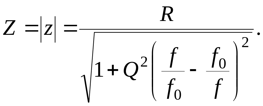 Полное сопротивление контура на резонансной частоте максимально и равно сопротивлению R. С отклонением от резонансной частоты (с увеличением расстройки относительно резонансной частоты) полное сопротивление контура уменьшается.