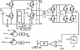 Принципиальная схема показана на рис. 3. В этом случае поток мощности от СБ и АБ, находящихся под управлением общей шины постоянного тока, передается в нагрузку через высокочастотный трансформатор, который обеспечивает гальваническую изоляцию между нагрузкой и системой СБ и АБ и повышение напряжения от цепи постоянного тока к нагрузке.