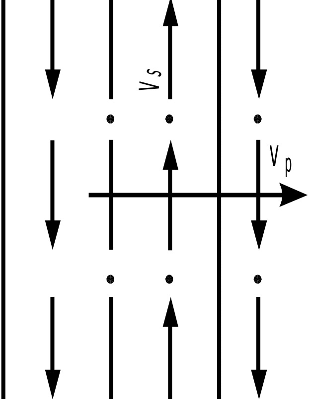 У поздовжній хвилі (Р) частинки середовища рухаються в напрямку розповсюдження хвилі (Рис. 1.2). Так плоска хвиля розповсюджується в напрямку осі Х і представляє собою чергування зон, які стиснуті та розтягнуті перпендикулярно до осі Х. Ці зони розповсюджуються з швидкістю Vр – швидкість хвилі. Процес послідовного розповсюдження деформації називається пружною хвилею. Геометричне місце точок простору, де пружні коливання середовища здійснюються синфазно (в одній фазі) називається фронтом хвилі.