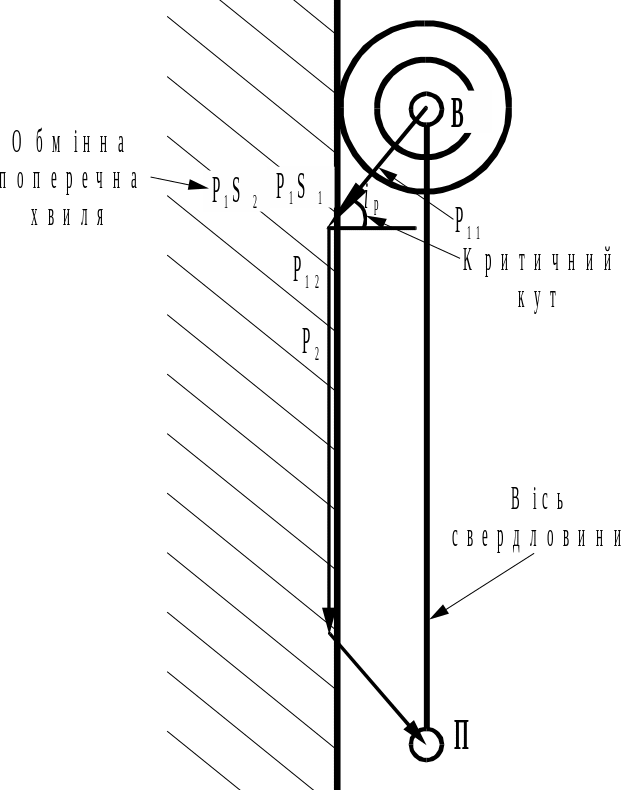 Таким чином, від випромінювача до приймача розповсюджуються три типи хвиль: а)головна поздовжня Р|2|, головна поперечна Р1S1 і пряма поздовжня Р1 з відповідним співвідношенням швидкості VРп>VSп>VPр. Відбита хвиля Р|| як правило, не спостерігається в силу великих кутів падіння 900 і малої енергії. Трьохелектродний зонд – два приймача, один випромінювач. Базою називається відстань між приймачами. Довжина зонда – відстань від випромінювача до дальнього приймача. Глибина дослідження визначається базою зонда, частотою пружних хвиль в породах, свердловинними умовами. З підвищенням частоти пружних коливань глибина досліджень зменшується. В середовищах з додатнім градієнтом хвильового опору по радіусу від стінки свердловини глибинність методу збільшується. При реєстрації кінематичних характеристик глибинність методу не перевищує 0,3 м. Глибинність досліджень по динамічних параметрах в 2 рази більша ніж кінематична.