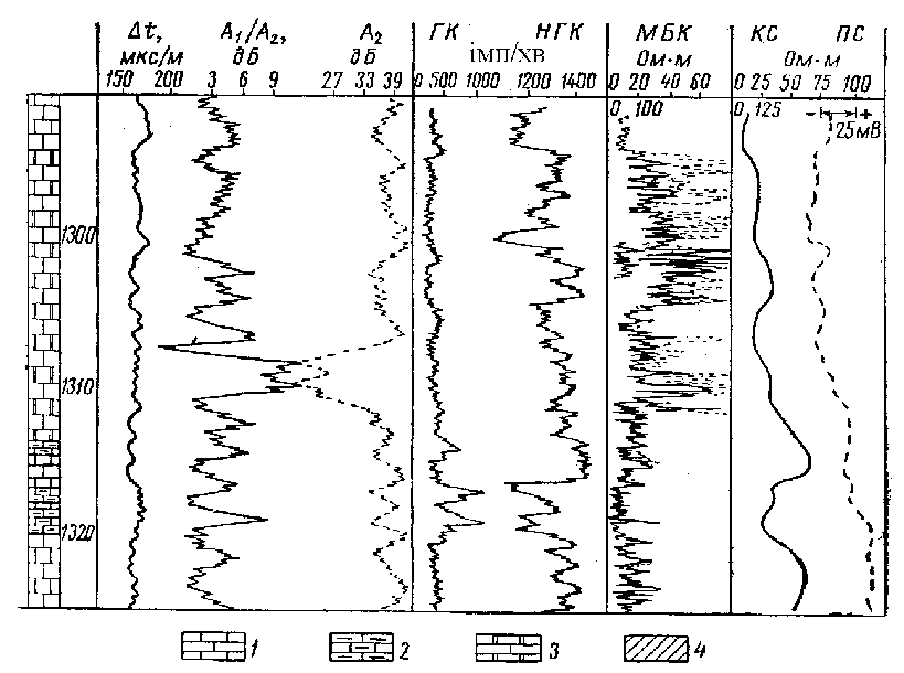 t – інтервальний час; А1/А2 – відношення амплітуди коливань, яка регіструється при акустичному каротажі відповідно на першому і другому приймачах; КС – крива знята зондом N7.5MO0.75F; МБК – крива отримана боковим мікрозондом; 1 – вапняк; 2 – глинистий вапняк; 3 – доломіт; 4 – тріщиновата порода.