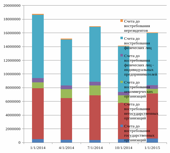 Счета до востребования некоммерческих организаций за анализируемый период однородной динамики не имели. На 1 апреля и 1 июля 2014 года наблюдается увеличение агрегата на 476 428 тыс. руб. и 107 088 тыс. руб. соответственно. За период агрегат снизился на 183 860 тыс. руб. (на 21,67%).