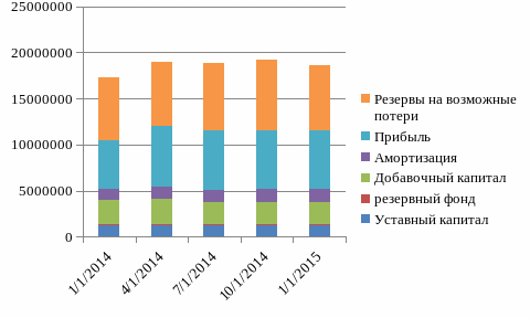 Собственный капитал банка в целом увеличился на 1 225 746 тыс. руб. (на 7,1%). На 1 июля 2014 года и на 1 января 2015 наблюдается снижение агрегата на 168 439 тыс. руб. и 632 594 тыс.руб. Тем не менее, увеличение собственного капитала банка является положительным моментом, так как он выполняет ряд важных функций, обеспечивая стабильность и надежность работы банка. Увеличение собственного капитала банка обеспечивается получаемой прибылью и ее долей, оставляемой в распоряжении банка. (Рисунок 13).