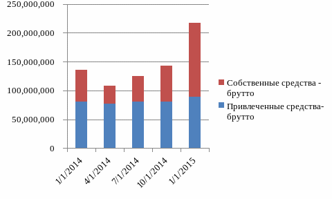 На 1 января 2014 года наибольшую долю в пассиве баланса банка занимают привлечённые средства-брутто. Удельный вес привлеченных средств-брутто составил 59,71 %, в то время как собственные средства-брутто занимали 40,29%. Однако, на 01.01.15 картина меняется, и собственные средства-брутто банка (59,07%) стали преобладать над привлеченными (40,93%).