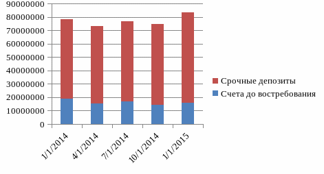 Показатель депозиты на 1 января 2014 года составлял 77 996 583 тыс.руб. Но к началу 2015 года показатель увеличился на 5 290 771 тыс.руб. и темп прироста за период составил 6,78%