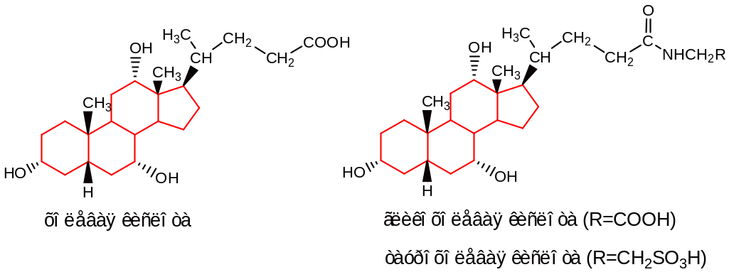 Желчные кислоты находятся в организме также и виде амидов по карбоксильной группе. Посредством амидной связи к ним могут быть присоединены остатки глицина – Н2NCH2COOH, как в гликохолевой кислоте, или таурина Н2NCH2CH2SO3H, как таурохолевой кислоте. Натриевые и калиевые соли желчных кислот обладают поверхностно-активными свойствами. Эмульгируя жиры пищи, они улучшают их усвоение, а также активируют фермент липазу, катализирующий гидролиз жиров.