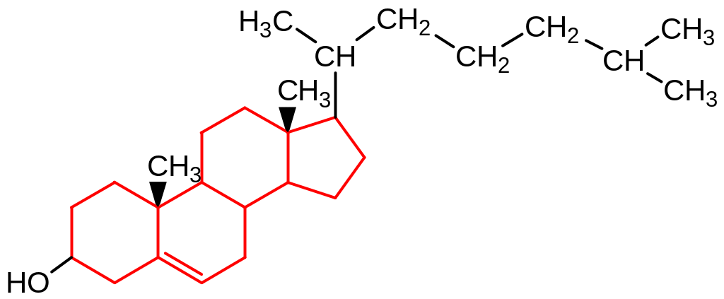 Общее количество холестерина в организме составляет 210-250 г. В больших количествах он содержится в головном и спинном мозге, является компонентом клеточных мембран. Из всего количества холестерина, содержащегося в организме, только около 20% его поступает с пищей. Основное количество холестерина синтезируется в организме из уксусной кислоты. Нарушение обмена холестерина приводит к его отложению на стенках артерий и, как следствие, уменьшению эластичности сосудов (атеросклерозу).