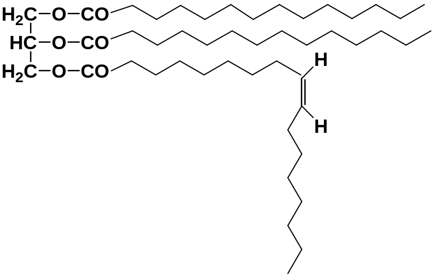 Наличие двойной связи с цис-конфигурацией, приводит к существенному изгибу углеродной цепи, вследствие чего нарушается упорядоченная укладка кислотных остатков. Это обстоятельство приводит к снижению температуры плавления триацилглицеринов с остатками ненасыщенных кислот (транс-конфигурация двойных связей не нарушает упорядоченной укладки кислотных остатков).