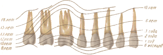 Первый моляры - 5-6 лет. Резцы центральные - 6-8 лет. Резцы боковые - 8-9 лет. Первые премоляры - 9-10 лет. Вторые премоляры - 11-12 лет. Клыки - 10—13 лет. Вторые моляры - 12-13 лет. Третьи моляры (зубы мудрости) - чаще 18-25 лет.