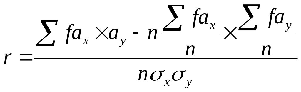 Коэффициент корреляции между изучаемыми признаками вычисляется по формуле: