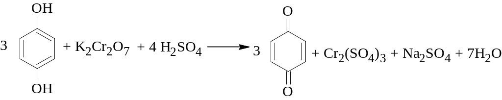 При перемешивании в колбу через коническую воронку аккуратно тонкой струйкой прибавляют 8 г (0,08 моль) концентрированной серной кислоты. Перемешивание продолжают в течение 5 минут. Через боковое горло колбы добавляют 7 г (0,026 моль) кристаллического дихромата калия небольшими порциями. Реакционная смесь должна хорошо перемешиваться, в противном случае может произойти осаждение продуктов окисления на дне и стенках колбы, что является причиной снижения выхода п‑бензохинона.