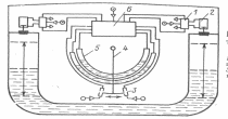 Рис.2.5 Схема успокоительной цистерны фирмы Интеринг.1-главный клапан цистерны, 2-цилиндр с перепускным клапаном, 3-воздушные насадки,4-маятник,5-меритильные трубки 6-жидкостный комплекс.