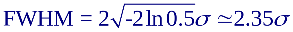 В качестве примера распределения Гаусса укажем измерение энергетических спектров частиц. При измерении энергетических спектров заряженных частиц на выходе усилителя спектрометра мы имеем сигналы, амплитуда которых несет информацию об их энергиях. За счет различных процессов, носящих случайный характер ( шумы детектора, флуктуации зарядового состояния ионов и т.п.), амплитуды сигналов от монохроматического источника имеют гауссово распределение, которое определяется двумя параметрами средним значением амплитуды сигнала Х и среднеквадратичным отклонением . Разрешение спектрометра – это полная ширина на половине высоты (Full Width at Half Maximum - FWHM). Для гауссового пика