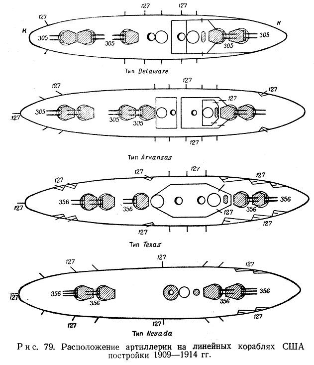 В основе артиллерийского вооружения американских линейных кораблей дальнейшей постройки видно стремление к увеличению силы крупнокалиберной артиллерии (рис. 79). На кораблях типа Delaware (1909 г.) с водоизмещением 20000 т и скоростью хода 21 узел десять 305-мм орудий размещены в пяти башнях, причем две кормовые башни размещены на одном уровне, а средняя возвышена. На линейных кораблях постройки 1911 г. типа Arkansas (26000 т) было установлено шесть двухорудийных 305-мм башен. Затем американцы переходят к постройке линейных кораблей типа Texas (1912 г.) водоизмещением 27000 т, со скоростью хода в 21 узел, с главной артиллерией 356-мм