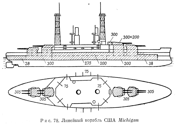 Первые американские линейные корабли нового типа Michigan (1908 г.) имели водоизмещение 16000 т и скорость хода 18,8 узла; расположение башен крупного (305-мм ) калибра показано на (рис. 78).