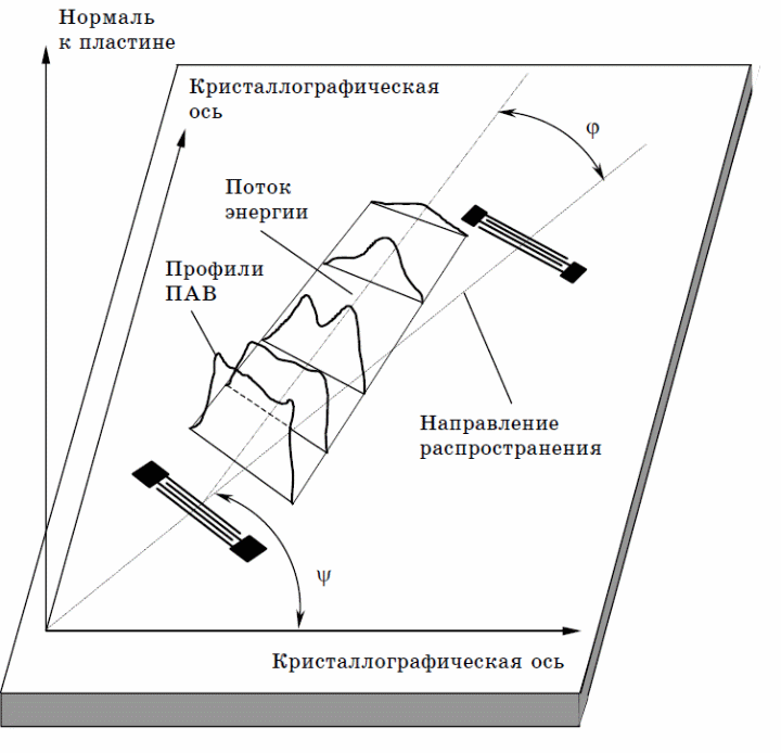 Если направление распространения ПАВ не совпадает с так называемым направлением чистой моды (ее угловое положение задается углом ψ0), то наблюдается отклонение потока энергии от направления распространения на угол φ (рисунок 2.3). Угол φ определяется соотношением:
