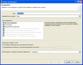 сконфигурировать эксперимент, выбрав параметры модели, которые вы хотите варьировать, и, задав значения, которые эти параметры должны будут принять за определенное вами количество прогонов модели, в окне свойств данного эксперимента;