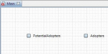 Чтобы создать поток, сделайте двойной щелчок мыши по накопителю PotentialAdopters, а потом щелкните по накопителю Adopters. AnyLogic создаст новую переменную-поток и сделает ее исходящим потоком для накопителя PotentialAdopters и входящим – для Adopters. На диаграмме появятся стрелки, которые будут обозначать образовавшиеся зависимости между потоком и эти- ми накопителями (рис. 19). Выделите созданную переменную в графическом редакторе и измените имя этого потока на AdoptionRate.