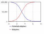 Изучите динамику изменения численностей потребителей и потенци- альных потребителей продукта с помощью диаграмм. Для этого создайте диа- грамму для отображения переменных Adopters и PotentialAdopters.