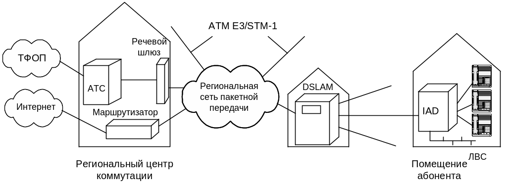 Сигналы DSL в форме пакетов или ячеек АТМ передаются в мультиплексор доступа DSLAM и далее через региональную сеть пакетной передачи соответственно на маршрутизатор Интернет и шлюз речевых сигналов, который является вторым ключевым элементом VoDSL. Поскольку телефонный трафик более чувствителен к задержке, чем передача данных, то в системе VoDSL пакеты, транспортирующие телефонный трафик, имеют приоритет перед пакетами, содержащими данные.