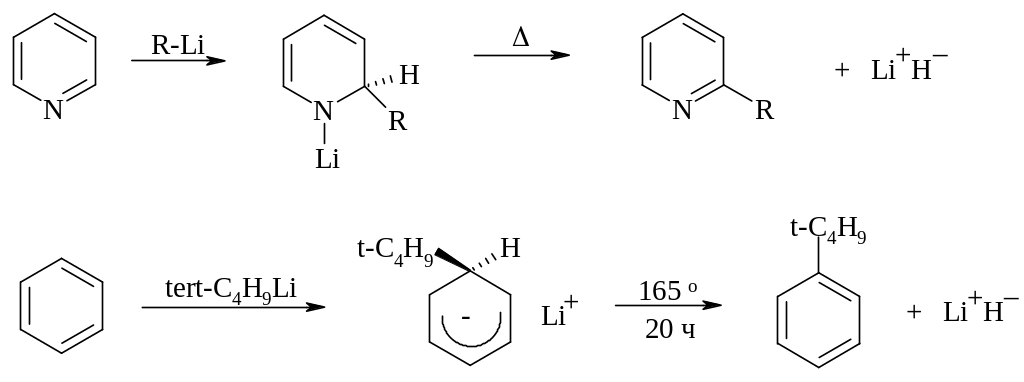 Почти все реакции, где замещается гидрид-ион, начинаются с образования -комплекса и в этом отношении они мало чем отличаются от других реакций SN2AE. Их главная специфика приходится на заключительную стадию, где происходит элиминирование гидрид-иона. Различают три разновидности этого процесса: 1) термическое отщепление, 2) окислительное и 3) автоароматизацию. Термическое (самопроизвольное) элиминирование требует высокой температуры и встречается главным образом у аддуктов ароматических субстратов с металлорганическими соединениями. Последнее вполне вероятно, поскольку нуклеофил в этом случае должен быть еще более сильным основанием, чем гидрид ион. Например, аддукты пиридина с литийалкилами при длительном нагревании в апротонной среде отщепляют гидрид лития и превращаются в 2-алкилпиридины. По-видимому, аналогичным образом бензол с выходом 15 % превращается в трет-бутилбензол при нагревании в трет-бутиллитием: