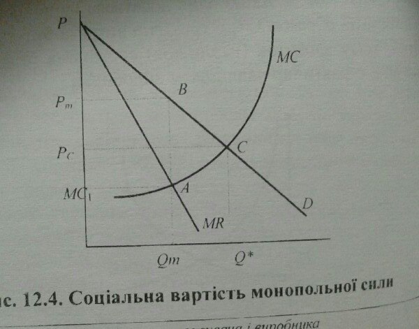 соціальна вартість монопольної сили– це втрати надлишку споживача і виробника, які обумовлені монопольним контролем за цінами . Це грошова вартість додаткового здобутку від обміну, якщо обсяг зростає до точки, в якій MB=MC. На рисунку показано, як визначається соціальна вартість монополії. Припустимо, що точка на кривій попиту для чистого монополіста відображає максимальну ціну, що її споживач може сплатити за кожну одиницю товару. Припустимо також, що МС зростають разом з обсягом виробництва і відображають його альтернативну вар- тість, враховуючи нормальний прибуток. Монополія володіє багатьма маленькими заводами.